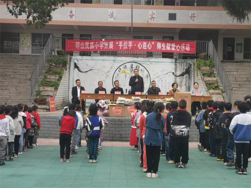 活动在嘹亮的《中华人民共和国国歌》声中拉开了帷幕。仪式上,迷路小学校长肖四明满怀感激之情,表达了对印山民族小学师生以及爱心人士的感谢,感谢您们的爱心、感谢您们的善举。同时还教导学生们一定要常怀感恩之心,努力学习,才不辜负所有默默关心他们的人。仪式的最后,朴实的杨深平校长向孩子们分享了自己的成长故事,勉励孩子们要热爱劳动,学会自立自强,勤奋学习,用知识改变命运,飞向更为广阔的天空。