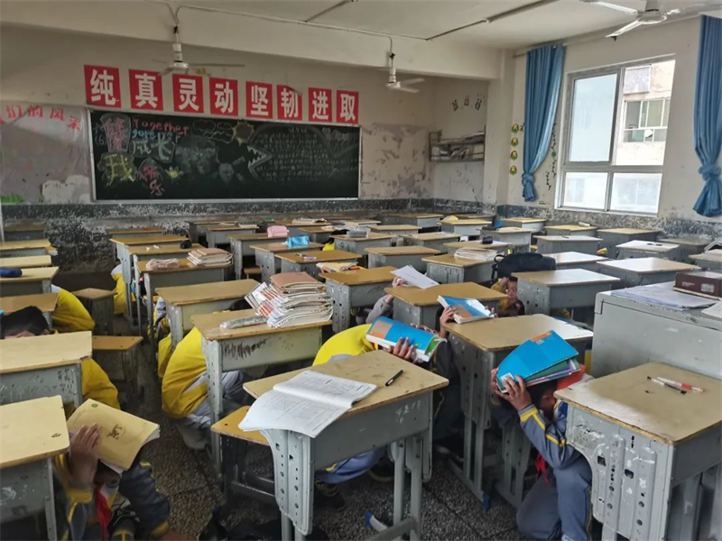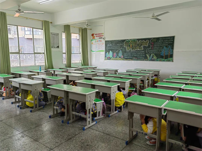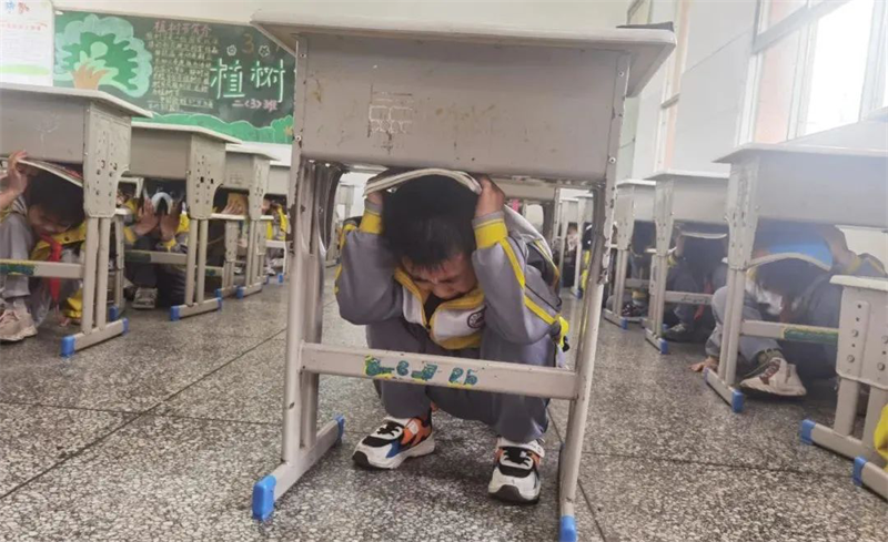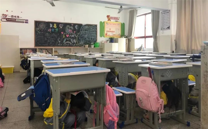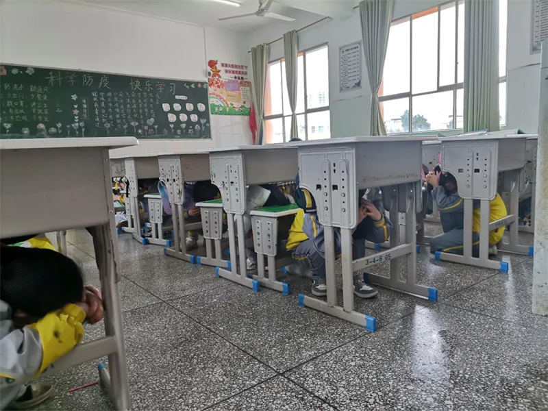 学生迅速躲避在课桌下方