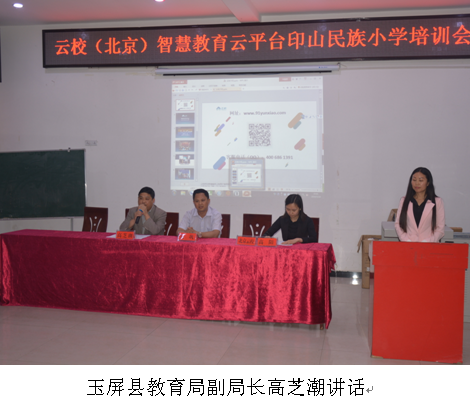 5月24日下午3时,云校(北京)科技有限公司在印山民族小学举行云校智慧教育平台应用培训,铜仁市教育局支助中心主任吴巩、玉屏县教育局副局长高芝潮陪同云校(北京)公司高级讲师高阳一同前往。
