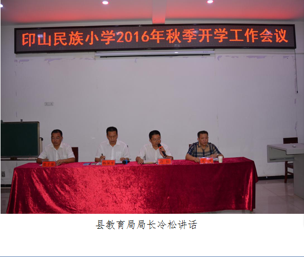 根据县教育局工作安排,结合学校实际,8月26日上午8:30分,印山民族小学2016年秋季开学工作会议在校阶梯教室召开,参加会议的有县教育局党委书记、局长冷松同志及全体教职工。