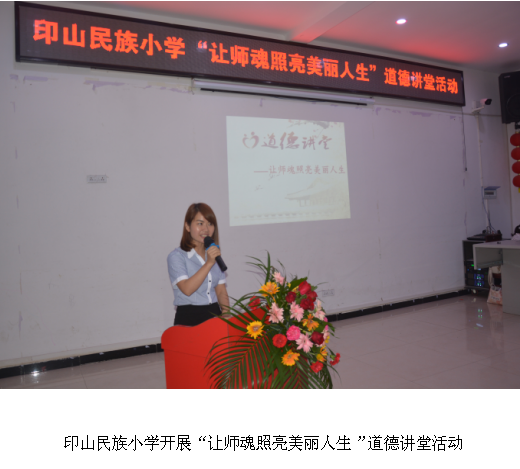 礼者、所以正身也;师者,所以正礼也。这次道德讲堂活动,给印山民族小学学校全体教师的思想带来了一次真正的洗礼,为学校提高办学质量、塑造良好形象再次写下了重重的一笔。