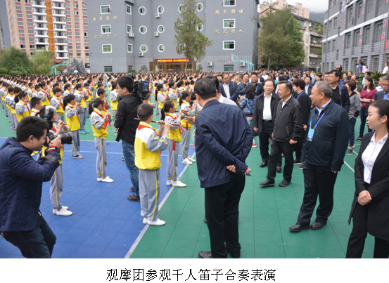 观摩团实地观摩了“民族文化进校园”大课间活动:千人箫笛演奏和“竹竿舞”、“跳绳”、“打鸡拐”等民间特色体育活动,领导们纷纷掏出手机拍摄学生活动时的精彩瞬间,了解了该校在弘扬和传承民族文化方面的工作开展和发展思路。接着,观摩团一行参观了充满浓郁箫笛文化氛围的玉屏箫笛博物馆。