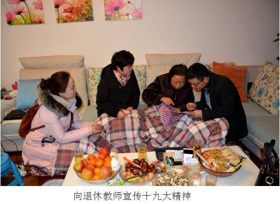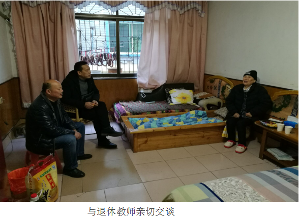 24日上午校领导和工会成员分成队,分别向退休教师们送上一份份新年的问候与祝福。慰问组每到一处都先送上十九大精神宣传册,向老教师们深入宣传以习近平同志为核心的党中央关注民生、关心群众的政策措施并与老教师们亲切攀谈,忆往事,拉家常,仔细询问他们的身体和生活状况,并为他们送上新春的祝福和春节慰问品。同时,也向离退休老教师介绍了一年来学校所取得的成绩,征求老教师们对学校工作的意见和建议,希望离退休老教师们能一如既往的关心和支持学校的发展和建设。一声声亲切的问候,道出深深敬意一句句真诚的话语,让老教师们充分感受到了学校领导对他们的关心,言谈话语中依旧充满着对教育事业的热爱和对学校的留恋,老教师们很是感慨并表示一定做到“老有所乐,老有所为”,全力支持学校工作。