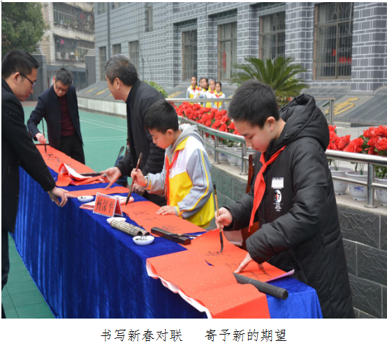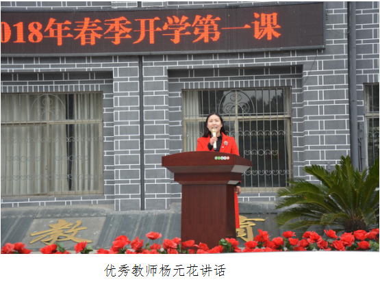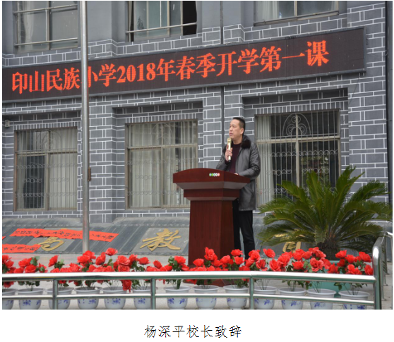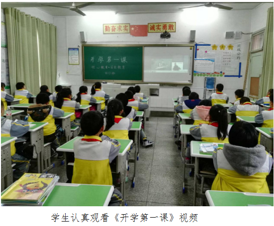 典礼在庄严有序的升国旗仪式中开始,在雄壮的国歌声中,国旗冉冉升起,全体学生怀着激动的心情齐唱国歌。升旗仪式后由教师代表、学生代表、家长代表进行了别具一格的书写新春对联展示,为新的学期送上最美好的祝福,表达了对新学期寄寓的深厚的期望。然后由杨深平校长致辞,杨校长对上学期学校各项工作进行回顾总结,对本学期工作提出了要求,对同学们提出了希望。然后由优秀教师代表杨元花发言,杨老师提出在新学期中我们面临新的挑战,同时也孕育新的希望和憧憬。我们每一位教师、学生都应站在新的起跑线上认真审视自己,以满腔的热情投入到新学期的工作与学习中去,以自己的勤奋与智慧,书写新学年学习与工作的新篇章。接着由优秀学生代表杨小瑶发言:新学期我们要做一个将文明懂礼貌的好学生;做一个遵纪守法的学生;做一个帮助老师和同学的学生,做一个锐意进取的学生。最后由各班选派一名代表上台展示、张贴新学期寄语。下午由各班班主任组织学生观看《开学第一课》视频。观看视频后各班结合本班实际对学生进行收心教育、传承中华美德等教育。