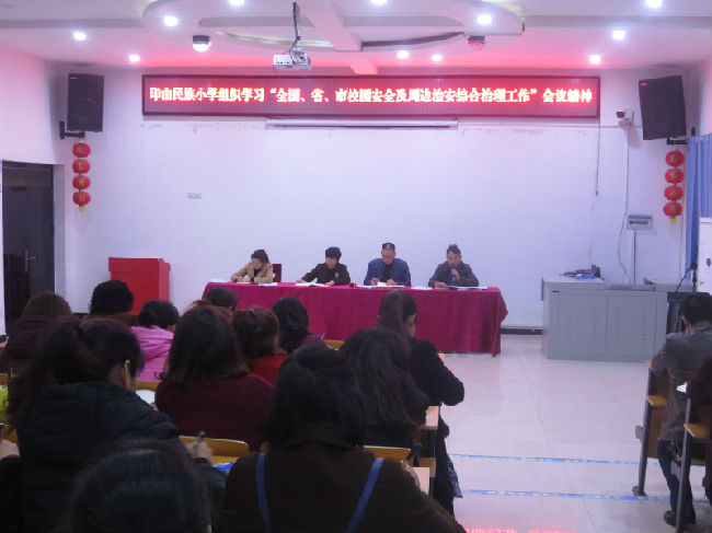 3月5日下午,印山民族小学在学校阶梯教室组织学习“全国、省、市校园安全及周边治安综合治理工作”会议精神。该校校长主持会议,全校150余名教职员工参加了此次会议。