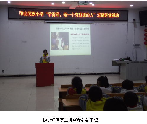 3月是“学雷锋月”,为倡导学生学习雷锋助人为乐的高尚情操。2018316日下午,印山民族小学二(1)班、五(6)班在学校阶梯教室开展了“学雷锋,做一个有道德的人”道德讲堂活动。
