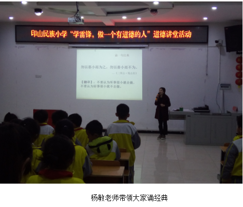 “学雷锋,做一个有道德的人”道德讲堂活动在全体师生齐声高唱《学习雷锋好榜样》的歌声中拉开序幕。此次“道德讲堂”活动一共有这样五个环节:唱一首歌曲,看一部短片,讲一个故事,谈一翻感悟,诵一段经典。活动中,同学们积极参与,热情洋溢,在观看雷锋的故事短片后对雷锋精神有了进一步的了解和体会。最后全体学生在杨敏老师的带领下吟诵经典名言 “勿以恶小而为之,勿以善小而不为”。