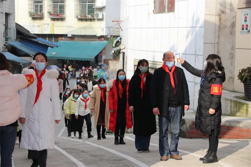 一、入校体温检测,在学校门口设置体温监测点,入校师生红外仪检测体温,学生在值勤教师的组织引导下,沿着学生通道间隔1米以上有序入校,值勤人员逐一对本通道学生进行手部消毒。
